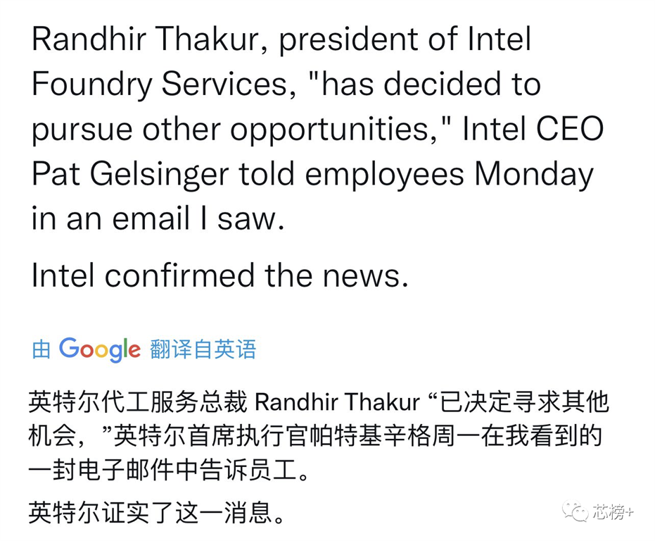 英特爾首席執(zhí)行官 Pat Gelsinger 向公司員工發(fā)送了一封電子郵件,感謝 Randhir Thakur 在建立英特爾芯片代工服務(wù)(IFS,Intel Foundry Services )方面的投入和對(duì)公司 IDM 2.0(集成設(shè)備制造 2.0)業(yè)務(wù)模式的幫助。